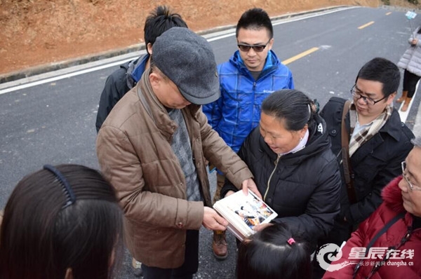 一見面,兩家人立馬親切地握起手來,“好久不見啊!”寒暄之意,仿若久未相見的親人。 星辰在線工作人員拿出三年前石大姐在長沙時拍攝的照片,制作成精美的相冊送到她手中,一群人高興地在路邊便看了起來,“你看,這是我哩!”