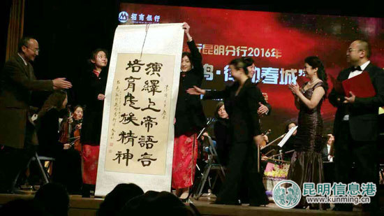 昆明信息港訊 記者李紅鸞 在2016年春節(jié)來臨之際,招商銀行在昆明勝利堂音樂廳舉辦“琴弦和鳴·律動春城”貴賓客戶新年音樂會。音樂會中高潮迭起,奔騰的《黃河》、凄婉的《梁?!?、歡快的《馬刀舞曲》,給觀眾不斷帶來美妙的享受。當(dāng)銀行領(lǐng)導(dǎo)把許紹德所寫草書“情系高山流水,韻追施特勞斯”、楷書“藝雅德馨”、隸書“演繹上帝語言、培育民族精神”三幅作品分別贈送國際著名小提琴演奏家高參、鋼琴演奏家鄭慧、音樂指揮家景煥時,全場立即響起熱烈的掌聲,一些觀眾和記者一樣沖近舞臺,拍下這難得的墨寶和熱烈場景。這一活動將音樂會的喜慶氛圍推向了高潮!