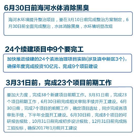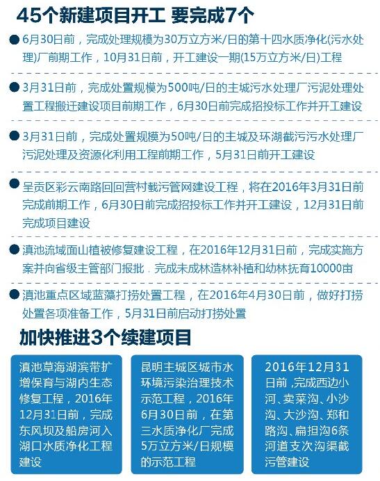 ????開工新建的45個滇池治理項目,確保年度完成投資9.1億元、完成7個項目建設。