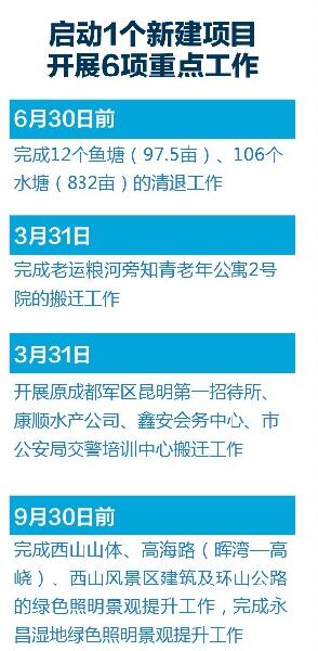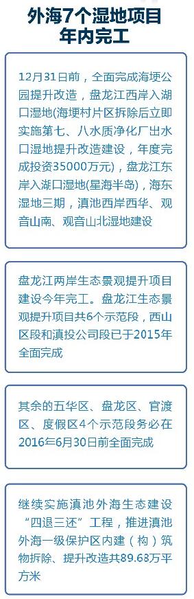 ????12月31日前,全面完成海埂公園提升改造,盤龍江西岸入湖口濕地,盤龍江東岸入湖口濕地(星海半島),海東濕地三期,滇池西岸西華、觀音山南、觀音山北濕地建設。