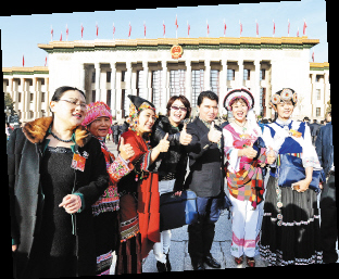 2015年兩會(huì)期間,云南代表團(tuán)的鐵飛燕(左四)等代表在北京人民大會(huì)堂外留影。