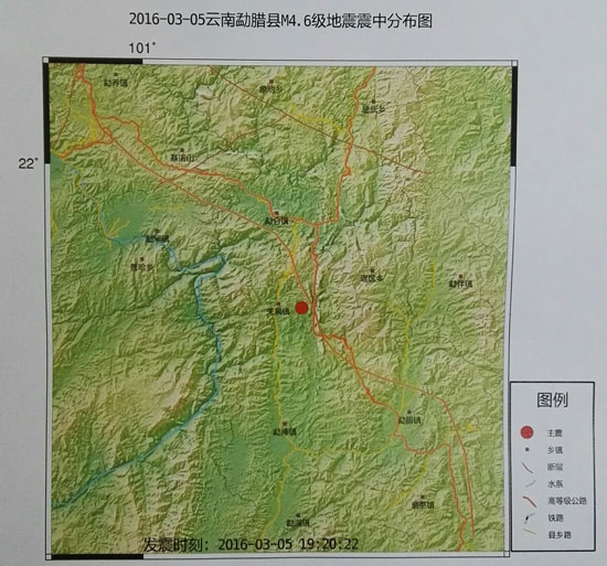 ????省地震局介紹說,據(jù)中國地震臺網(wǎng)測定,北京時間2016年3月5日19時20分,我省西雙版納州勐臘縣(北緯21.71度、東經(jīng)101.35度)發(fā)生4.6級地震,震源深度6公里。震中距勐臘縣城城區(qū)約35公里、距景洪市市區(qū)約65公里、距普洱市市區(qū)約130公里、距昆明市市區(qū)約380公里。震中30公里范圍內(nèi)平均海拔約1050米,勐臘縣縣城、關(guān)累鎮(zhèn)、勐侖鎮(zhèn)等震感明顯,截至目前震中附近暫無人員傷亡情況報告。