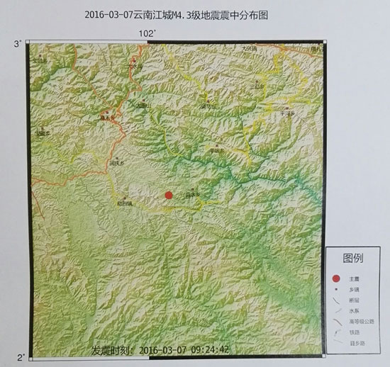 ????同據(jù)中國地震臺網(wǎng)測定,北京時間2016年3月7日9時24分,我省普洱市江城縣(北緯22.52度、東經(jīng)102.07度)發(fā)生4.3級地震,震源深度10公里。震中距江城縣城區(qū)約23公里,縣城震感強烈,江城縣曲水鎮(zhèn)壩傘村部分房屋有梭瓦現(xiàn)象,截至目前震中附近暫無人員傷亡情況報告。