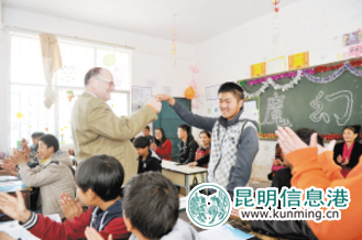 ????現(xiàn)在,孩子們就面臨著一個挑戰(zhàn),如何用英語和一個外國人交流,而不是填出試卷上的空格。這節(jié)課上,David說得最多的話就是“good”、“excellent”,做得最多的動作就是當學生回答問題時,翹起大拇指或舉起孩子的手歡呼。氣氛越來越活躍,一個女老師拿著吉他走上講臺,教學生們唱了一首英文歌《you are my sunshine》,David將趙老師請上臺,又把孩子一個個“抓”上講臺,圍在老師身邊,一起唱歌。