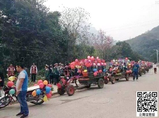 ????3月10日上午,在五顏六色的氣球裝點(diǎn)下,一支由16輛手扶拖拉機(jī)組成的迎親車隊(duì)浩浩蕩蕩地行駛在紅河州元陽縣南沙街頭,在當(dāng)?shù)匾鹆瞬恍〉霓Z動(dòng)。這些拖拉機(jī)“婚車”,引得不少市民圍觀,并拍照、拍視頻發(fā)在微信朋友圈里。
