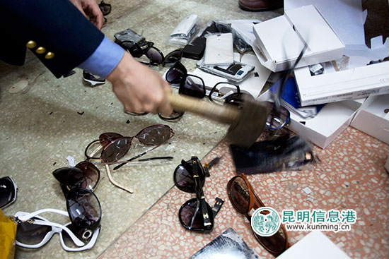 執(zhí)法人員用錘子砸碎假名牌眼鏡 記者曲鳴飛/攝