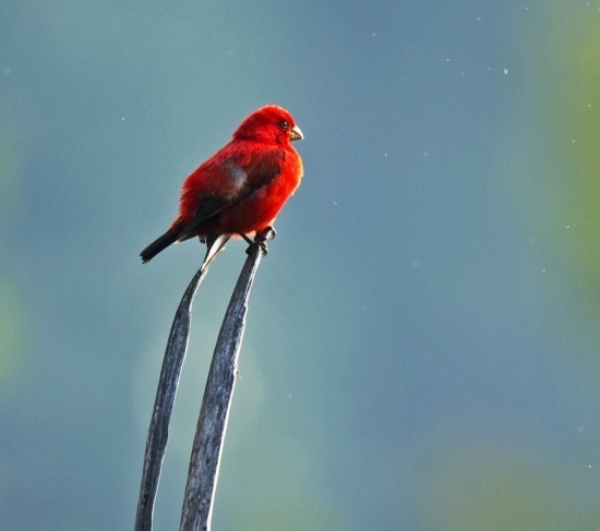 ????它因羽毛顏色獨(dú)特而著稱,鳥友均以拍到它而驕傲,它就是高黎貢山上的紅色精靈——血雀。血雀的名稱因為成年雄鳥一身通紅的色彩而得。但其實(shí)成年的雄鳥并不是滿身都是紅色,在它雙翅邊緣的羽毛一般都有黑色點(diǎn)綴,而血雀的雌鳥則一般呈草黃綠色,真正全身通紅的是剛度過青春期的雄鳥,也被稱為亞成雀。