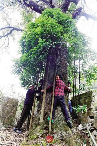 ????4位村民用手臂丈量楠木古樹(shù)周圍。