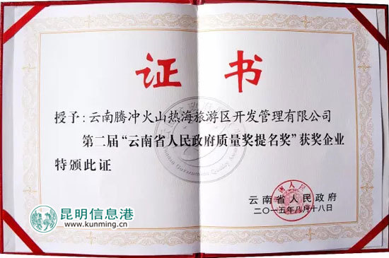 ????昆明信息港訊 記者上官艷君 記者獲悉,騰沖火山熱海公司在日前召開的云南省人民政府組織召開的全省質(zhì)量強省大會(電視電話會議)上,被授予云南省第二屆“政府質(zhì)量獎提名獎”獎牌證書。