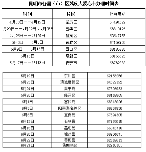 ????屆時,凡昆明戶籍殘疾人及在昆居住、持有《殘疾人證》、《居住證》的殘疾人,可到相應片區(qū)的指定地點辦理殘疾人愛心卡,具體辦卡地點可撥打各片區(qū)聯(lián)系電話咨詢。