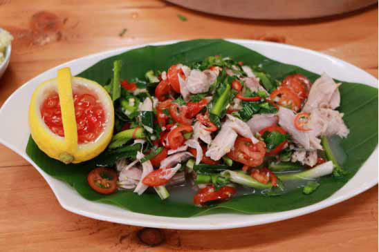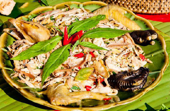 ????鬼雞是景頗族的一道傳統(tǒng)美食,當(dāng)?shù)赜杏秒u祭鬼神的習(xí)慣,祭完鬼神后,取雞肉撕碎,加小米辣、芫荽、檸檬等一起在野外拌食,自然的檸檬香和芫荽之清新融入雞肉,酸香醒胃,加上姜蒜與辣椒釋放出的復(fù)合辣味,別有一翻原始風(fēng)情,讓人一口接上一口,欲罷不能。為了能常常吃到這道美味,聰明的景頗族人將“鬼雞”端上了飯桌,并作為款待客人的上好佳肴。