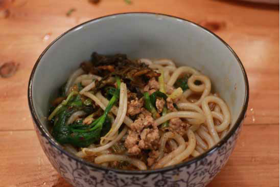????對一個(gè)云南人來說,吃完了鬼雞,總覺得還是缺點(diǎn)兒什么,這不,雷裴然又麻利地做了一碗小鍋米線。錚亮的銅鍋用水洗過之后,放在大火上,加入高湯,先放韭菜煮一下,再放入米線、鮮肉等,而且小鍋米線一定是一鍋一鍋煮的,煮完馬上吃,否則面會(huì)糊掉。米線里一定少不了兩樣佐料,一樣是酸腌菜,其實(shí)就是蓋菜,不僅莖葉脆嫩,口味清香,而且含有豐富的蛋白質(zhì),維生素和礦物質(zhì);另一樣是昭通醬,色澤棕紅,鮮艷油潤,醬香濃郁,麻辣咸香,堪稱云南省的“醬類之冠”。