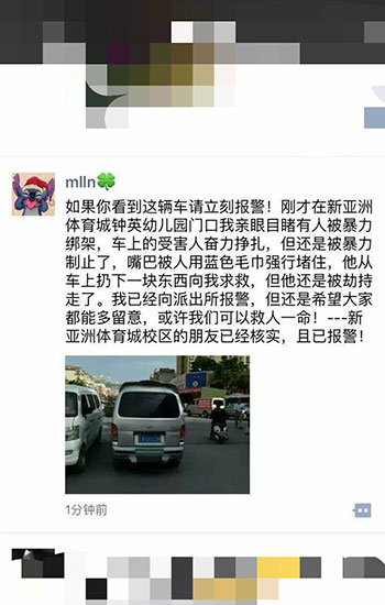 ????發(fā)朋友圈的網(wǎng)友疑為現(xiàn)場目擊者,其稱:“如果你看到這輛車請立刻報警!剛才在新亞洲體育城鐘英幼兒園門口,我親眼目睹有人被暴力綁架,車上的受害人奮力掙扎,但還是被暴力制止了,嘴巴被人用藍(lán)色毛巾強(qiáng)行堵住,他(受害人)從車上扔下一塊東西向我求救,但他還是被劫持走了……”信息后附著一張銀色面包車圖片,車牌為昆明牌照。