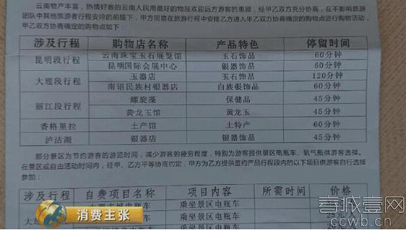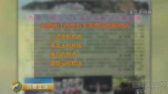 ????五天四夜的大理麗江之旅,記者參加的是報(bào)價(jià)600元的旅行團(tuán),行程單上只有2個(gè)購(gòu)物店,實(shí)際卻是6個(gè),增加了3道茶購(gòu)物店、黃龍玉購(gòu)物店、藏藥購(gòu)物店和螺旋藻購(gòu)物店4個(gè)購(gòu)物點(diǎn)。