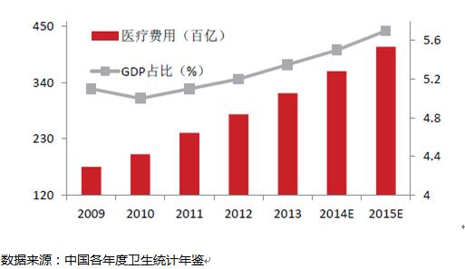 ????圖2: 2009年-2015年我國醫(yī)療衛(wèi)生費(fèi)用及占GDP比重情況