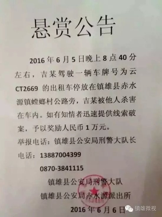 ????6月6日,鎮(zhèn)雄縣公安局刑偵大隊(duì)、鎮(zhèn)雄縣公安局赤水源派出所發(fā)布懸賞公告稱:6月5日晚上8點(diǎn)40分左右,吉某駕駛一輛車牌號(hào)為云CT2669的出租車停放在鎮(zhèn)雄縣赤水源鎮(zhèn)螳螂村公路旁,吉某被他人殺害在車內(nèi)。有知情者迅速提供線索破案,予以獎(jiǎng)勵(lì)人民幣1萬(wàn)元。
