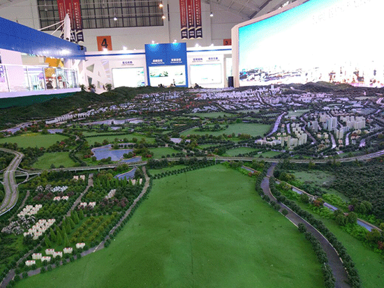 在滇中新區(qū)展區(qū),該區(qū)的總體規(guī)劃通過一個(gè)巨型的沙盤模型進(jìn)行立體化展示,高樓、道路、綠地等一目了然地展現(xiàn)在人們面前,十分壯觀。