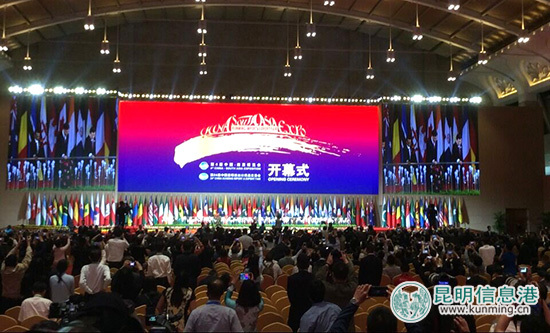 走進(jìn)7號(hào)開幕大廳可以看到,主席臺(tái)碩大的屏幕上,顯示著“第4屆中國(guó)—南亞博覽會(huì)暨第24屆中國(guó)昆明進(jìn)出口商品交易會(huì)開幕式”的字樣,屏幕前方,“中國(guó)·昆明”4個(gè)大字尤為醒目。