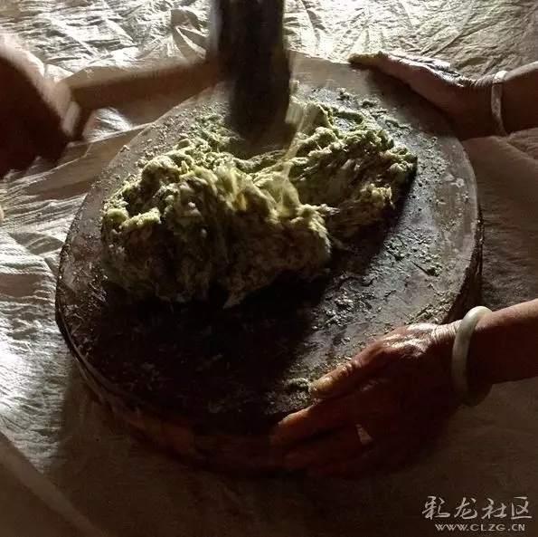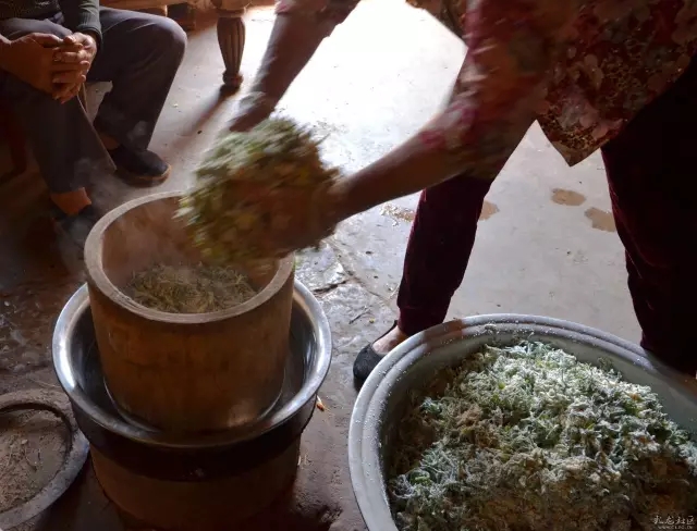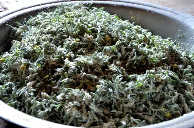 ????采擷那豆田里的面蒿,要選好時(shí)機(jī),就是綠油油的豆苗長勢最旺盛的時(shí)候,也正是面蒿最肥嫩的時(shí)候。趁面蒿剛打苞、還沒有開花時(shí)就采擷好,剔去底部的梗與葉片,專門留下嫩絨絨的,洗凈晾會,然后準(zhǔn)備配料:選用上好的糯米水磨掉醬面泡發(fā),然后將鮮嫩的面蒿和糯米掉醬面放在石臼里舂,舂得細(xì)細(xì)的,舂的過程中,還要用勺子之類的物件在石臼里翻,把面蒿和糯米掉醬面攪拌均勻了。