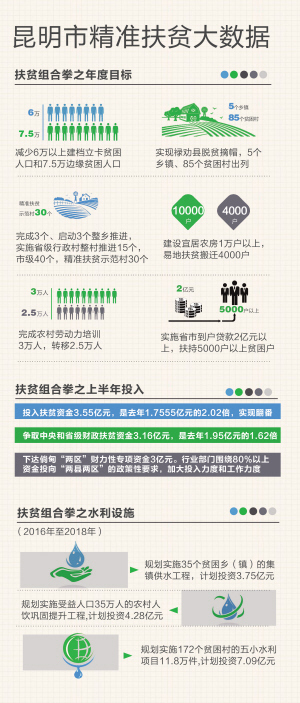 圍繞脫貧攻堅總體要求,昆明市創(chuàng)新工作理念,結(jié)合實(shí)際制定了“六個一批”精準(zhǔn)扶貧、精準(zhǔn)脫貧方案,即發(fā)展生產(chǎn)脫貧一批、務(wù)工增收脫貧一批、易地搬遷脫貧一批、生態(tài)補(bǔ)償脫貧一批、發(fā)展教育脫貧一批、社會保障兜底一批。