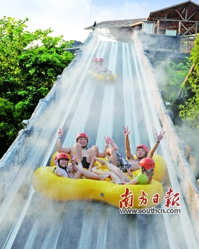 佛岡一景區(qū)內(nèi),游客們坐著“冰河歷險(xiǎn)船”從高處漂下。袁小燕/攝