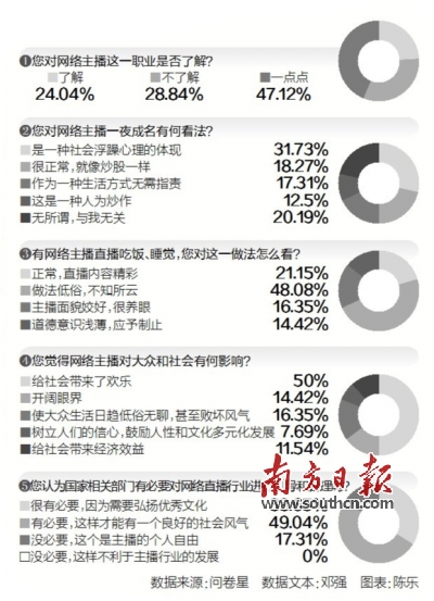 ????日前,問卷星網(wǎng)發(fā)起一項“關(guān)于網(wǎng)絡(luò)主播”的調(diào)查。調(diào)查結(jié)果顯示,超七成的受訪者對網(wǎng)絡(luò)主播這一職業(yè)有所了解,這說明網(wǎng)絡(luò)直播已經(jīng)成為一種現(xiàn)象,為多數(shù)人所知曉。