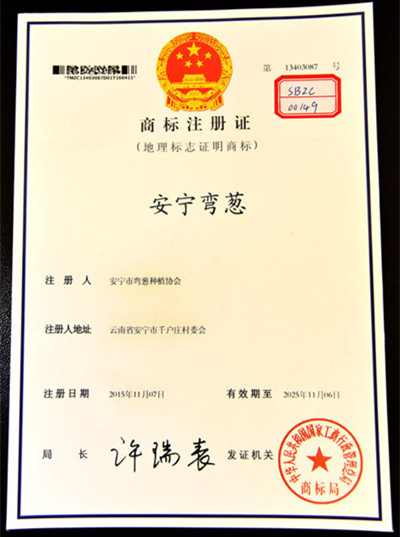 7月19日,安寧市召開(kāi)新聞發(fā)布會(huì)通報(bào):“安寧彎蔥”地理標(biāo)志商標(biāo)已經(jīng)申報(bào)成功并由國(guó)家知識(shí)產(chǎn)權(quán)局商標(biāo)局授牌,這是安寧市繼“安寧紅梨”、“八街食用玫瑰”獲得審批授牌之后獲得的第三個(gè)安寧市轄區(qū)的地理標(biāo)志商標(biāo),一個(gè)縣市區(qū)同時(shí)擁有3個(gè)地理標(biāo)志商標(biāo),在昆明市各縣區(qū)還是第一家。