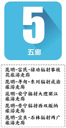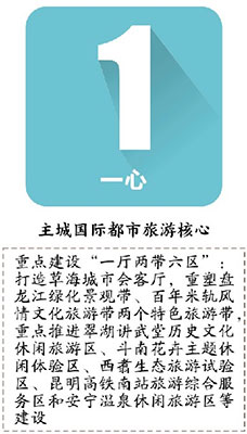 ????“一心”,即主城國際都市旅游核心,使之成為全市旅游的服務(wù)中心、全域旅游體驗中心、都市時尚區(qū)和歷史文化展示窗口?!耙蝗Α保喘h(huán)滇池生態(tài)文化旅游圈。“三片”,即全面提升大石林、陽宗海、轎子山三大重點片區(qū),優(yōu)化片區(qū)綜合旅游功能,實現(xiàn)旅游產(chǎn)品轉(zhuǎn)型升級?!拔謇取?,即昆明—富民—祿勸輻射攀枝花旅游走廊,昆明—尋甸—東川輻射成渝旅游走廊,昆明—安寧輻射大理麗江旅游走廊,昆明—晉寧輻射西雙版納旅游走廊,昆明—宜良—石林輻射兩廣旅游走廊。
