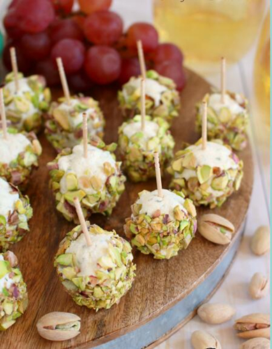 ????2.用牙簽自上而下穿入葡萄內,再將裹了奶酪的葡萄球放到盛滿切碎的開心果仁的盤子里,使葡萄均勻地沾滿碎堅果。