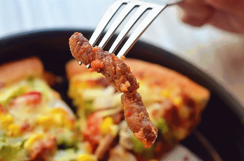 ????Pizza內(nèi)置大肉條,同樣來自隔壁吃辣大戶,成都特產(chǎn)燈影牛肉條。