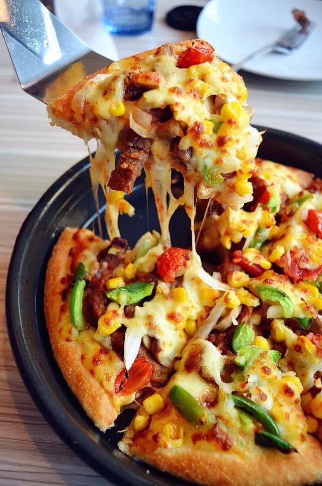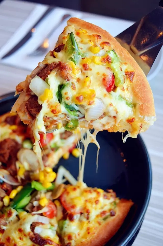 ????比薩里鑲嵌著飽滿的蔬菜粒,玉米、蘑菇、櫻桃番茄也被混合上了花椒、剁椒等等酷辣元素,酷辣升級,辣得實(shí)在痛快。