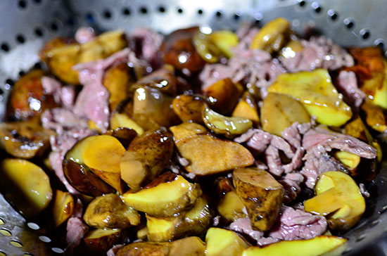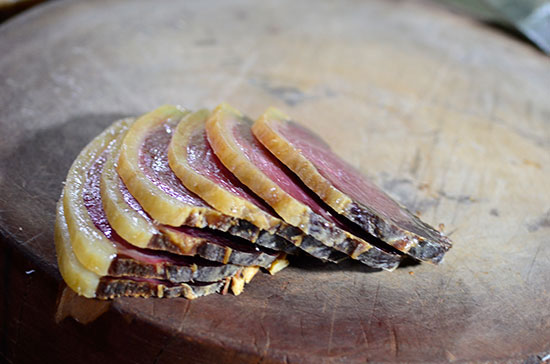 色佳味美的牛干巴來(lái)自壯牛。每年過(guò)完寒露,回族群眾便開(kāi)始宰牛腌制干巴。宰牛由阿訇下刀,經(jīng)放血、剝皮、開(kāi)膛等,然后順著肉逢剖成24塊“骨施特”(即凈肉)。腌制一般按6%至8%的比例,將鹽撒在肉上搓揉,再放入陶制的大缸內(nèi)腌,缸口須用硬紙或麻布蓋緊扎好,腌20天至30天便可以出缸晾曬,直至肉面干硬呈板栗色。每頭牛宰后可腌24塊牛干巴,又稱12對(duì),食用時(shí)煎煮均可,尤以香油煎吃為妙。煎干巴片酥脆味醇,油而不膩,為酒席上的佳肴。