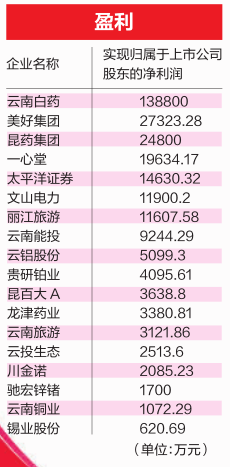 從31家公司上半年報告中所列的“實現(xiàn)歸屬于上市公司股東的凈利潤”單項數(shù)據(jù)來看,云南本土31家上市公司今年上半年實現(xiàn)利潤的有18家,包括昆藥集團、川金諾、貴研鉑業(yè)、文山電力、錫業(yè)股份、云南白藥、云鋁股份、云南銅業(yè)、云南能投、云南旅游、麗江旅游、昆百大A、馳宏鋅鍺、一心堂、太平洋證券、美好集團、龍津藥業(yè)、云投生態(tài)。