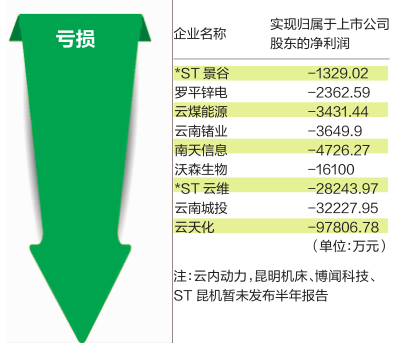 31家上市公司年中報顯示為虧損狀態(tài)的企業(yè)有9家,包括云南鍺業(yè)、云南城投、沃森生物、云煤能源、*ST云維、云天化、*ST景谷、南天信息、羅平鋅電。其中,云天化虧損最為嚴重,是9家虧損企業(yè)中虧損金額最大,利潤跌幅最高的企業(yè)。