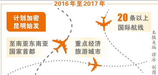 ????在加密航線方面,2016年至2017年,計(jì)劃加密昆明始發(fā)至南亞?wèn)|南亞國(guó)家首都、重點(diǎn)經(jīng)濟(jì)和旅游城市等國(guó)際航線20條以上。