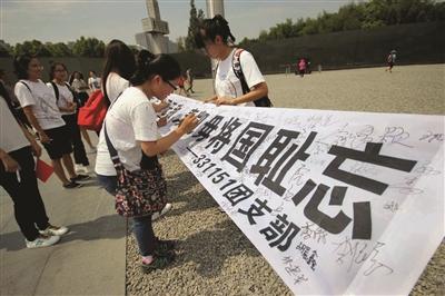 ????2016年9月3日,是中國(guó)人民抗日戰(zhàn)爭(zhēng)勝利71周年紀(jì)念日,來(lái)自南京東南大學(xué)成賢學(xué)院的數(shù)十名大學(xué)生,來(lái)到侵華日軍南京大屠殺遇難同胞紀(jì)念館的廣場(chǎng)上,手拿“須知正義原無(wú)敵,奏凱毋將國(guó)恥忘”等標(biāo)語(yǔ)的條幅,請(qǐng)參觀的人們簽字。參觀群眾紛紛停下腳步,在條幅上莊重的寫下自己的名字,“不忘歷史、世界和平”是每位中國(guó)人的心聲。新華報(bào)業(yè)視覺(jué)中心記者 宋寧/攝