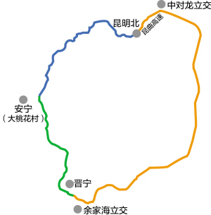 ????起于昆曲高速中對(duì)龍立交,連接空港、嵩明、宜良、澄江、晉寧五個(gè)縣(區(qū)),終止于昆玉高速余家海立交