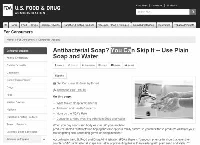????美國食藥局官網(wǎng)以“ 使用普通肥皂和清水更好”為題進行了相關介紹。