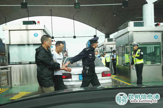 犯罪嫌疑人劉某(左二)在昆明西收費(fèi)站被抓獲。記者合宇聰翻拍