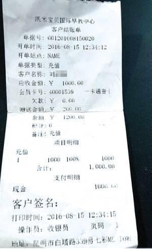 早教中心會(huì)員卡及消費(fèi)單 供圖