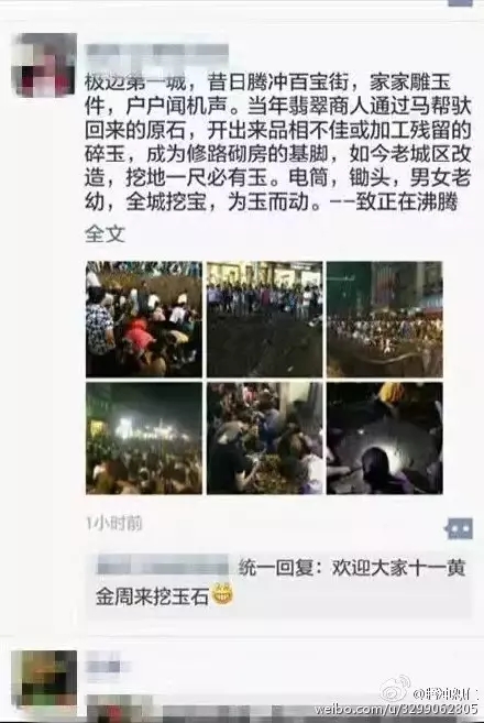 ????昨晚,騰沖又一次成為網(wǎng)紅,不是因為它的旅游,而是這里開啟了全民挖玉模式。因為騰沖市舊城改造,道路挖出不少散碎玉石,知道消息的市民,紛紛手持電筒、抓釘,走上街頭,開始了“發(fā)家致富”。