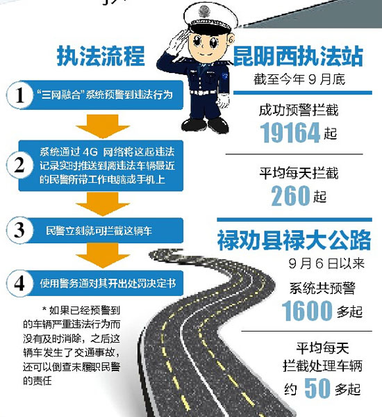 ????云南省前年就已啟用全國(guó)公安交管“六合一”平臺(tái),這個(gè)系統(tǒng)對(duì)機(jī)動(dòng)車(chē)管理系統(tǒng)、駕駛?cè)斯芾硐到y(tǒng)、道路交通違法系統(tǒng)、道路交通事故處理系統(tǒng)、劇毒化學(xué)品運(yùn)輸、交警隊(duì)信息平臺(tái)等六大系統(tǒng)進(jìn)行了整合,使全國(guó)交警車(chē)駕管系統(tǒng)互聯(lián)互通,提高了內(nèi)部工作效率。云南省交警總隊(duì)馬峻嶺總隊(duì)長(zhǎng)認(rèn)為:“云南交警要做到‘三網(wǎng)融合’,向科技要警力,精準(zhǔn)打擊嚴(yán)重交通違法行為,減少交通事故?!?/p>