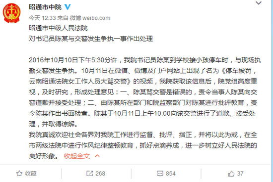????10月11日,微信、微博及門戶網站上出現(xiàn)了名為《停車被罰,云南昭通法院女工作人員大罵交警》的視頻,昭通中院獲取該信息后,院黨組高度重視,及時研究,形成處理意見:一、陳某罵交警是錯誤的,責令當事人陳某向交警道歉并接受處理;二、由陳某所在部門和院監(jiān)察部門對陳某進行批評教育,責令陳某作出書面檢查。