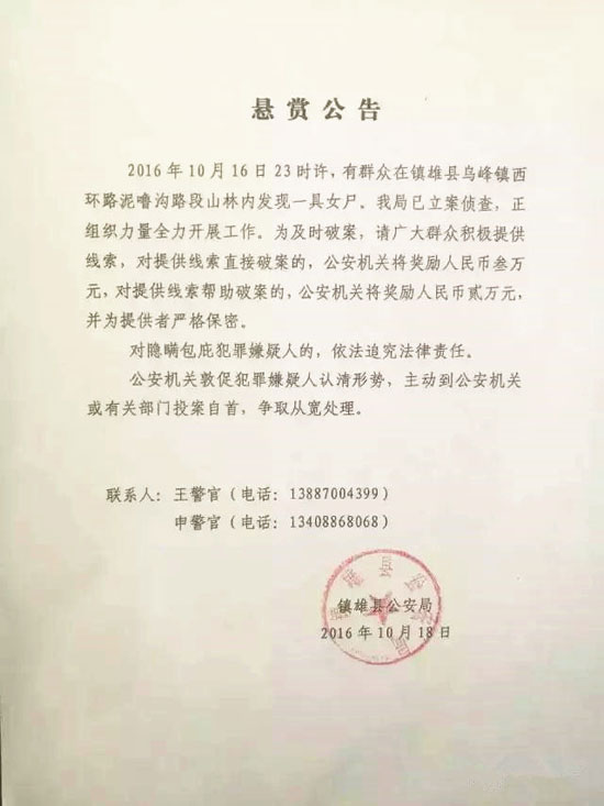 ????10月18日, 鎮(zhèn)雄縣公安局發(fā)布懸賞公告,請廣大群眾積極提供線索,協(xié)助公安機關早日破案。同時敦促犯罪嫌疑人早日到公安機關投案自首,爭取從寬處理。