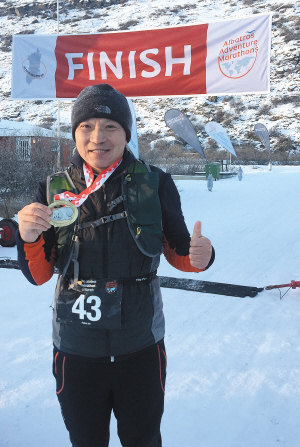 為了能獲得這塊格陵蘭北極圈馬拉松的獎(jiǎng)牌,金飛豹可謂拼盡了全力,“42.195公里的賽道上沒有觀眾和拉拉隊(duì),每5公里設(shè)一個(gè)補(bǔ)給站,僅有保溫壺里的溫水。因?yàn)橘惖拉h(huán)境惡劣,跑過風(fēng)口時(shí)感覺風(fēng)快把人吹上天,事先聽說每個(gè)補(bǔ)給站都會(huì)有溫水和能量食品,我為了減輕負(fù)擔(dān)沒攜帶補(bǔ)充體能的能量食品,因?yàn)闅鉁睾?,體能消耗較大,才跑了15公里就腹中空空,跑過20公里的補(bǔ)給站時(shí)已是饑腸轆轆,好不容易跑到25公里的補(bǔ)給站,終于吃到了世界上最難吃的能量食品,但我還是把它當(dāng)成最美味的美食吃了下去?!苯痫w豹回憶起來臉上是又幸福又痛苦的表情。
