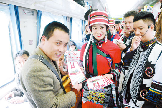 列車上,身著石林彝族撒尼服飾的文藝演員一路載歌載舞,演奏月琴、三弦、葫蘆絲等民族樂器,通過有獎(jiǎng)知識競答、石林特色工藝品、名特產(chǎn)品推介展示、精美宣傳品發(fā)放等熱鬧互動(dòng),讓不少旅客對石林豐富的旅游資源和特色產(chǎn)品產(chǎn)生了濃厚興趣,主動(dòng)向工作人員索要宣傳資料、上網(wǎng)查詢石林信息、拍照錄視頻在微信朋友圈分享。值得一提的是,此次營銷活動(dòng)還推出了通游石林景區(qū)、乃古石林景區(qū)、長湖景區(qū)和大疊水景區(qū)會(huì)員年卡,憑此趟“石林號”火車票免費(fèi)游石林喀斯特博物館,石林風(fēng)景名勝區(qū)管理局、石林冰雪海洋世界、石林喀斯特地質(zhì)博物館、水上石林溫泉度假村聯(lián)合免費(fèi)贈(zèng)出總價(jià)值逾萬元門票等優(yōu)惠活動(dòng)。