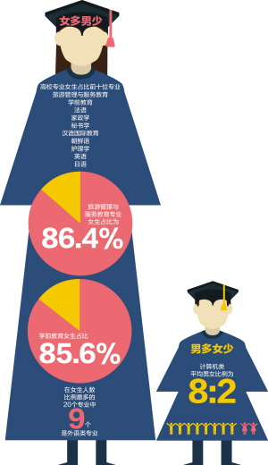 ●青島高校的部分文科專業(yè),男女比例高達1比8,中國海洋大學2014級英語專業(yè)研究生秦瑾暉說班里有26個人,只有3個男生,差不多10比1。
