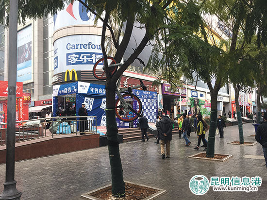 對(duì)此,昆明步行街管理辦公室相關(guān)負(fù)責(zé)人張健介紹,今年1月起,步行街內(nèi)騎行、停放單車(chē)的現(xiàn)象逐漸增多,原來(lái)為了方便殘疾人通行的通道,被不少市民當(dāng)成騎車(chē)進(jìn)步行街的通道。為了保持步行街的有序,管理方增加了4名工作人員專(zhuān)門(mén)管理亂停、亂放的現(xiàn)象。“步行街禁止機(jī)動(dòng)車(chē)、非機(jī)動(dòng)車(chē)駛?cè)牒屯7牛M麖V大騎行者將車(chē)停在步行街外?!睆埥≡俅翁嵝选?/p>