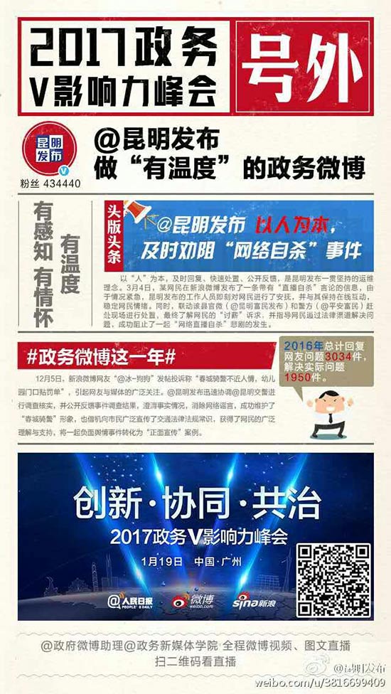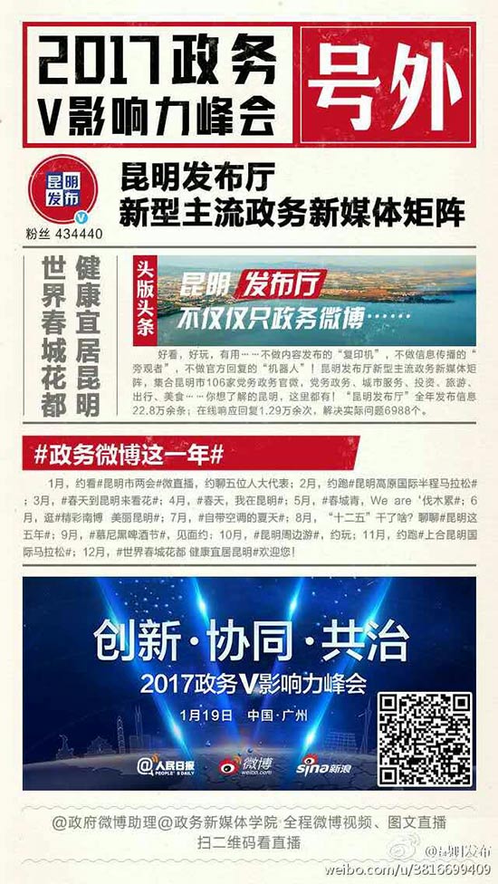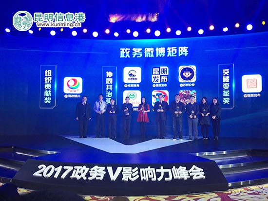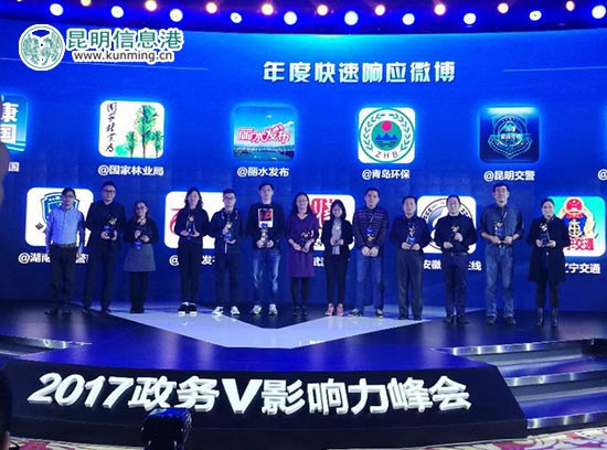 ????昆明信息港訊 記者肖蜜娟 1月19日,由人民日報、微博、新浪網(wǎng)聯(lián)合舉辦的“創(chuàng)新·協(xié)同·共治——2017年政務V影響力峰會”在廣州舉行,大會邀請了國家、省、市各級各類政府機構領導參加,共同總結分享2016年度政務微博運維成績,深入探討政務微博發(fā)展趨勢。同時,大會重磅發(fā)布了《2016政務微博矩陣發(fā)展報告》,并首次頒發(fā)全國優(yōu)秀政務微博矩陣大獎,“昆明發(fā)布廳”榮獲微博矩陣“協(xié)同共治”獎,“昆明模式”成為全國政務微博發(fā)展模板之一。除“昆明發(fā)布廳”以外,昆明市還有@昆明交警 也在本屆峰會上榮獲2016年度“快速響應”微博稱號。