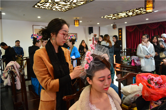 ????“一枝桃花滿庭春,千張笑顏玉泉美”,經(jīng)過激烈角逐最終進(jìn)入復(fù)賽的10名彩妝師,通過靈動(dòng)不羈的線條符號(hào)、精致別樣的造型搭配,描繪了或性感、或玩趣、或調(diào)皮的桃花妝容。正在對(duì)作品進(jìn)行最后點(diǎn)綴的選手董佳麗說:“全是親手的做的,包括發(fā)飾上的、衣服上的桃花都是從桃花枝上一個(gè)個(gè)摘下來,再用線串起來,再用珍珠還有小珠子等等的飾品做成的?!?/p>